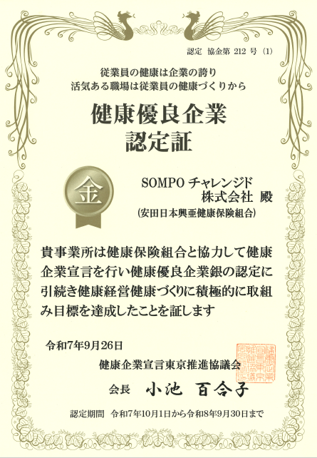| 2025年9月26日 | 当社の健康づくりの取り組みが高く評価され、昨年度に引き続き、健康企業宣言東京推進協議会が運営する、健康優良企業「金の認定」に認定されました。 | ||||